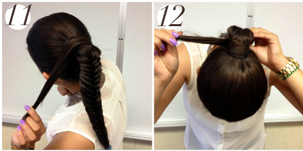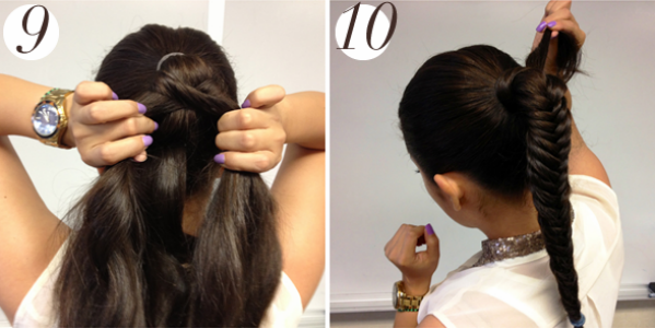 Sau khi tết xong, tháo lọn tóc đã cố định ban đầu xuống, quấn quanh phần tóc đã buộc cho tới hết. Dùng ghim cố định lại và bạn đã có một kiểu tóc đuôi ngựa được tết đuôi cá ấn tượng và trẻ trung.