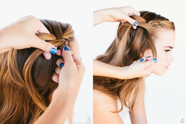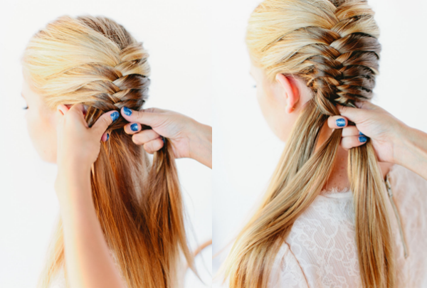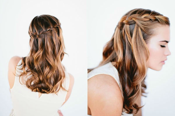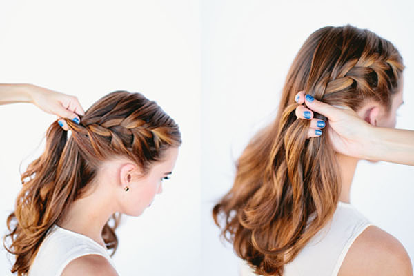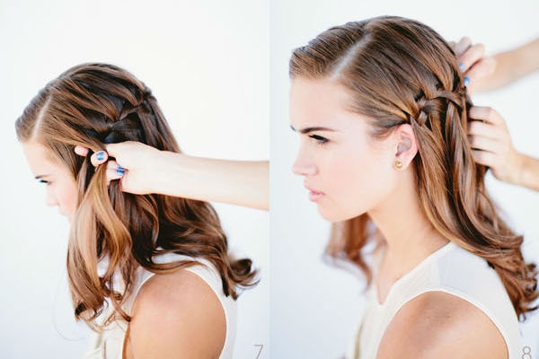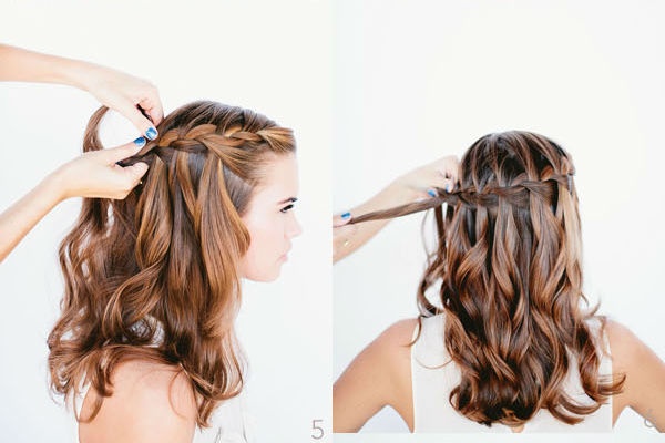 1. Tóc tết thác nước: Để tết được kiểu tóc đầy lãng mạn này, bạn cần lấy 3 lọn tóc ở bên mang tai phải (trái), bắt đầu tết ba thông thường từ trên xuống.