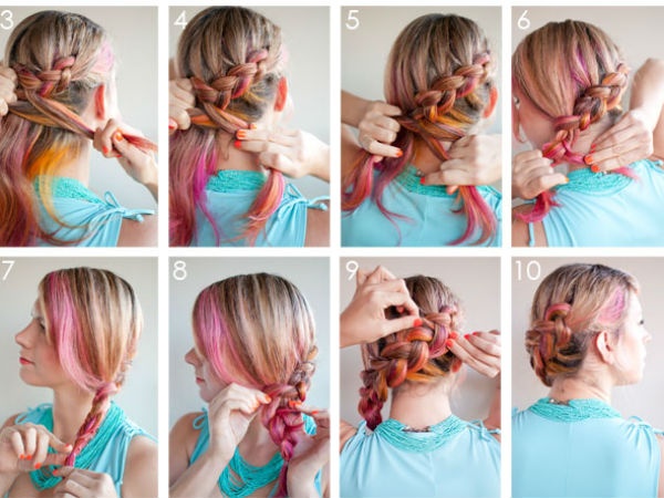 | Cứ lần lượt theo quy trình: tết ba, thả một lọn tóc cũ, lấy một lọn tóc mới, bạn sẽ có một đường tóc tết vắt ngang qua đầu như hình. Cố gắng tết đều tay và lấy các lọn tóc thật đều để các sóng tóc thêm đẹp. |