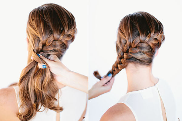 Để đơn giản, bạn chia toàn bộ phần đuôi tóc thành hai phần. Tiếp tục chia mỗi phần tóc thành 2 lọn, rồi lấy lọn ngoài cùng bên trái kéo sang lọn bên phải. Ngược lại, lấy tiếp 1 lọn ngoài cùng bên phải kéo sang bên trái. Lần lượt cho tới khi hết toàn bộ tóc, dùng dây chun cố định lại.