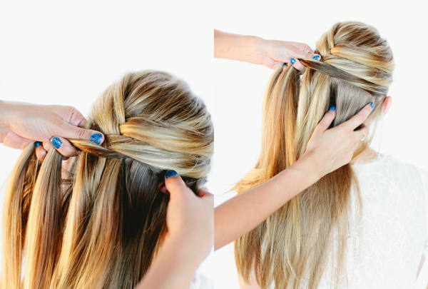... tiếp tục chia mỗi phần tóc trên thành 2 lọn rồi lấy một lọn ngoài cùng bên trái để kéo sang lọn bên phải và ngược lại. Thực hiện tương tự như vậy cho đến khi hết toàn bộ phần tóc.