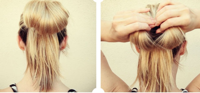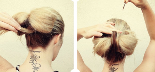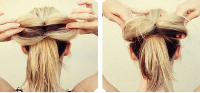 | Bạn cũng có thể tạo kiểu nơ bướm bằng toàn bộ phần đuôi tóc của mình. Đầu tiên, buộc tóc kiểu đuôi ngựa với độ cao tuỳ sở thích của bạn rồi buộc chặt lại bằng dây chun. Sau đó, tiếp tục buộc gấp đôi phần đuôi tóc để thừa lại 1/2 tóc thẳng xuống như hình vẽ bên trái. |