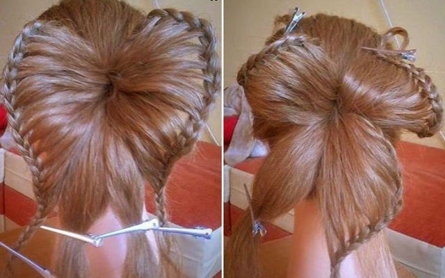 Để tết được kiểu tóc bướm ấn tượng như hình bên tay trái, đầu tiên bạn gái buộc tóc cao vừa phải sau đó, chia phần đuôi tóc thành 4 phần, cố định lại bằng cặp ghim.