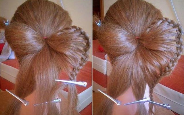 Sau khi tết xong cả 4 phần tóc như hình mẫu bên trái, bạn gái vắt phần đuôi tóc tết bên dưới lên phần cột tóc đuôi ngựa ban đầu sao cho đều để tạo thành hình cánh bướm tròn rồi cố định lại bằng cặp tóc.