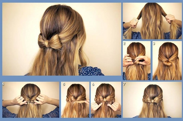 Tóc buộc một nửa là một trong những kiểu tóc được rất nhiều bạn gái yêu thích vì sự dịu dàng và nữ tính mà nó mang lại. Để tô điểm cho mái tóc này thêm xinh xắn, bạn gái hãy biến một phần của đuôi tóc thành một chiếc nơ xinh xắn như hình vẽ.