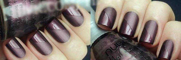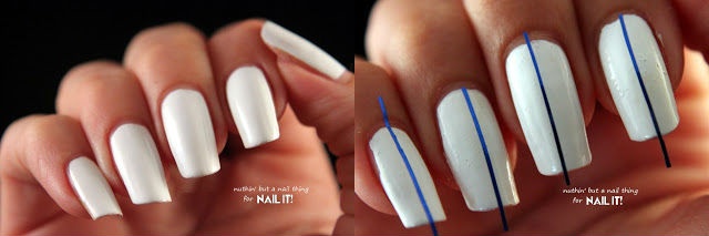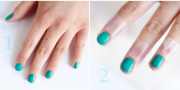 Đối với những bạn gái thích tô điểm cho bộ móng tay của mình, ngoài các loại sơn móng tay đủ màu, đủ loại, băng dính sẽ là thứ phụ kiện không thể thiếu trong mỗi lần vẽ nail. Để biến một lớp sơn màu lì thêm phần bóng, sáng, bạn gái hãy dùng băng dính chia đôi phần móng như hình vẽ.
