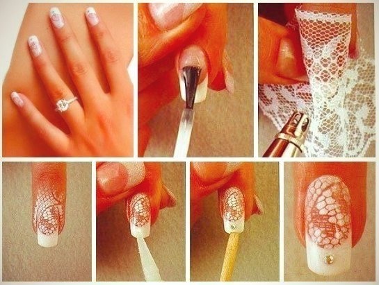 Nếu như không có băng dính, bạn gái có thể sử dụng vải ren để tô điểm thêm hoa văn cho bộ móng tay của mình. Hãy sơn một lớp sơn bóng lên móng rồi đặt lớp vải hoa lên, sơn tiếp màu sơn trắng lên móng. Chờ phần sơn hơi se, nhẹ nhàng nhấc lớp vải lên. Làm lần lượt và bạn sẽ có một bộ móng tay với những hoạ tiết rất lạ mắt.