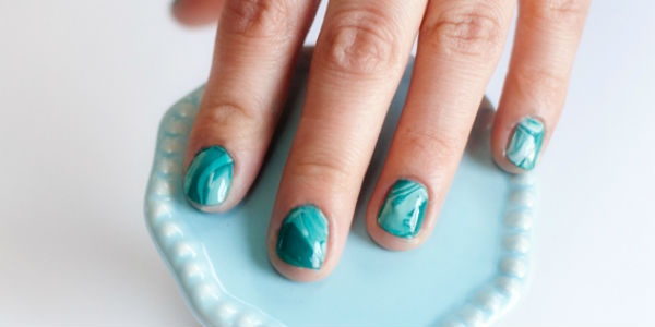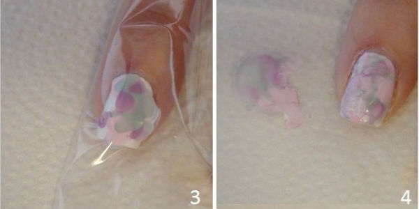 Nếu như không muốn nhúng ngón tay vào sơn, bạn có thể tham khảo cách sau đây. Sơn móng tay màu nền trắng. Sau đó, nhỏ một vài giọt sơn móng tay các màu khác nhau lên.
