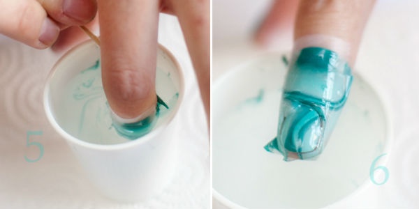 Nhúng từng ngón tay một vào phần sơn đã hoà trong cuốc nước. Chờ lớp sơn hơi se lại, bạn nhẹ nhàng tháo lớp băng dính đã dán ra.