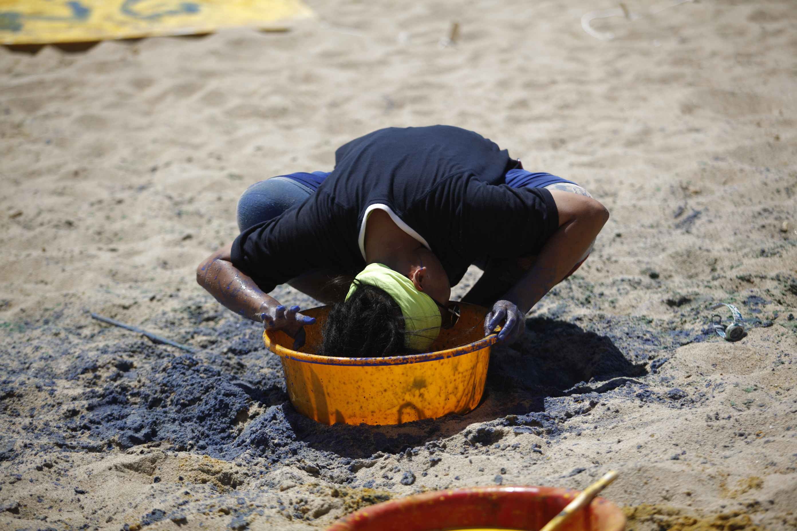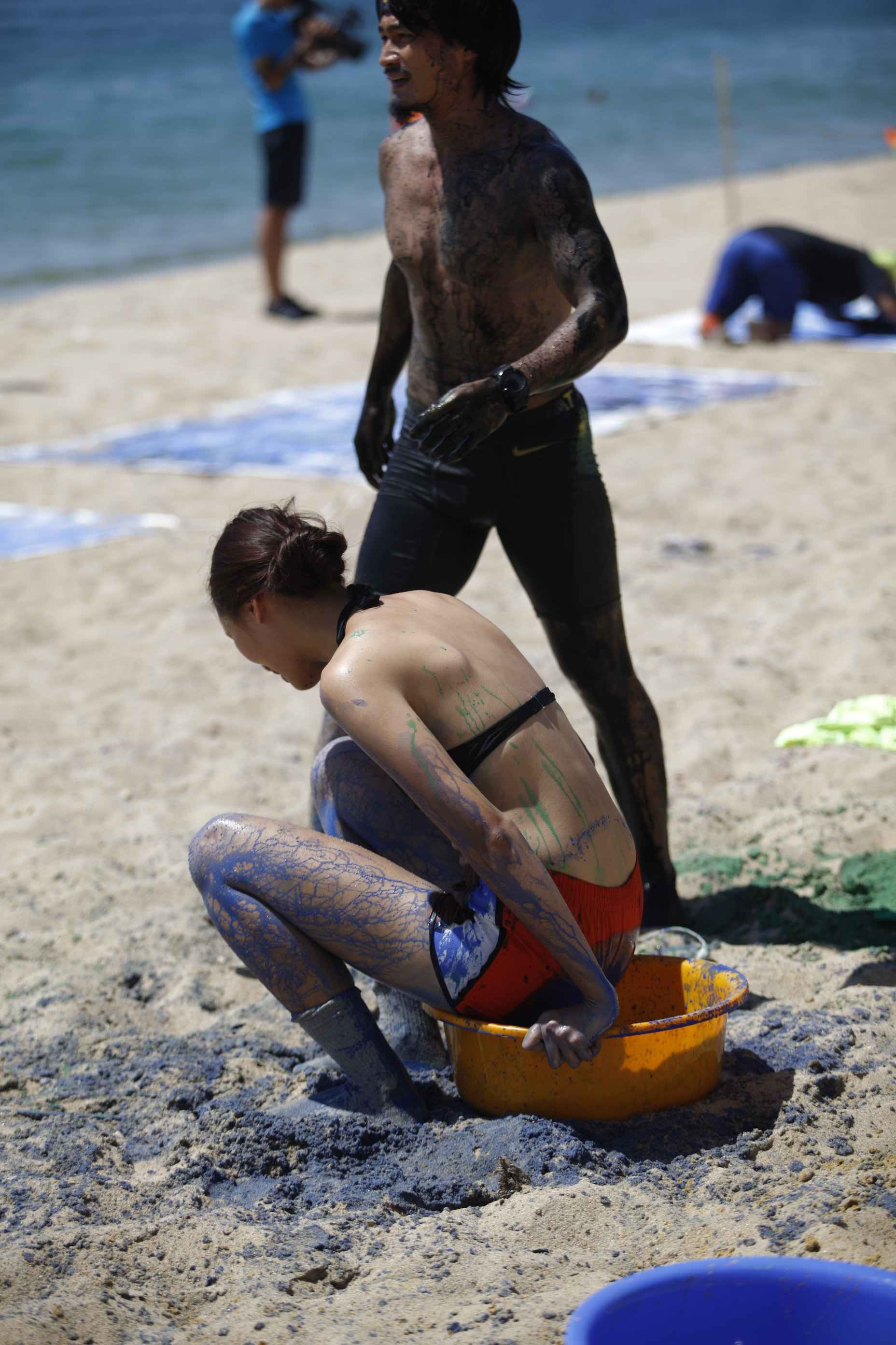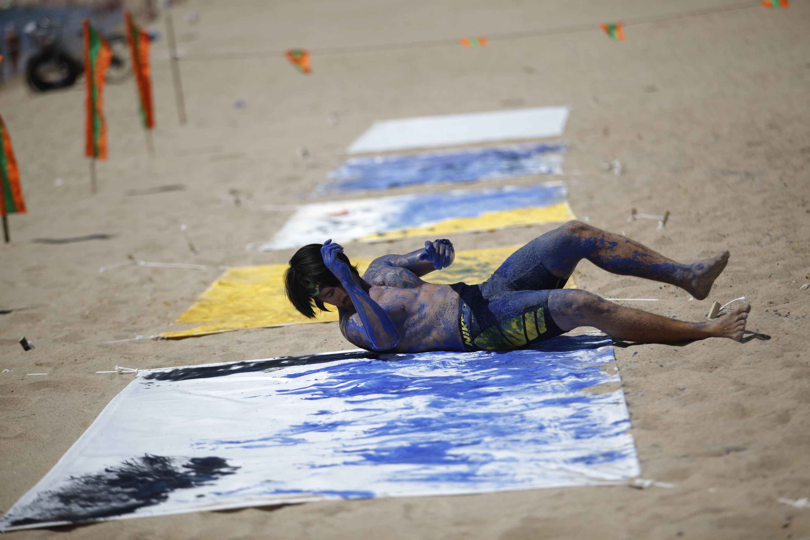 | Với mái tóc dài và dày, An Đinh của đội Vàng đã tranh thủ dùng "vũ khí" này như một chiếc cọ để hoàn thành tác phẩm. |
