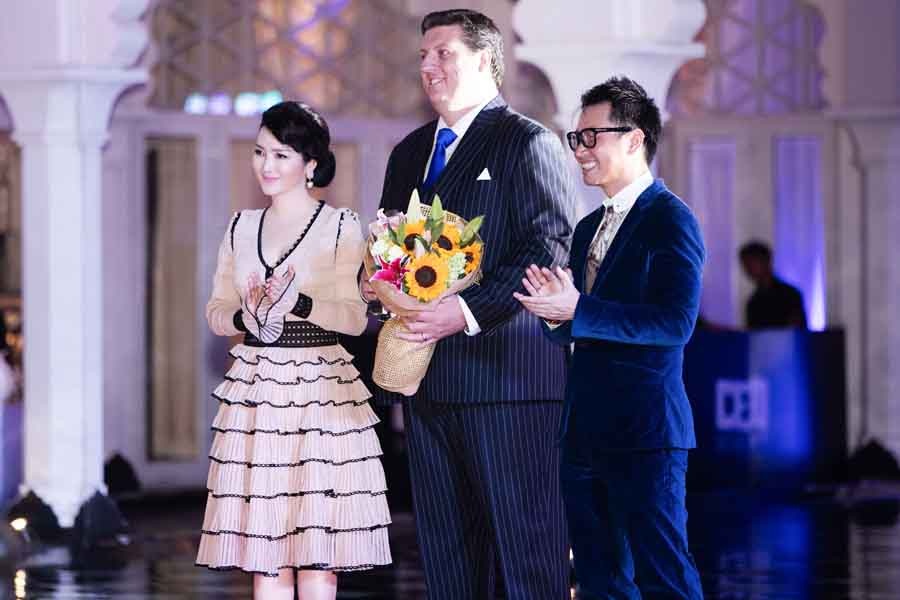 | Hồ Vĩnh Khoa, nhà thiết kế Lý Quí Khánh thân thiết ở buổi tiệc. |