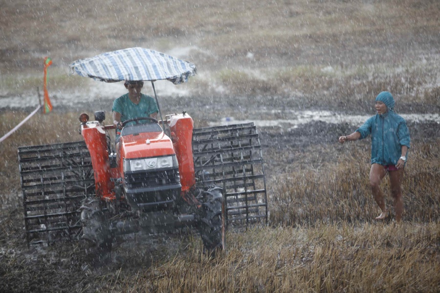 | Đội Xanh Ngọc cày đồng giữa cơn mưa tầm tã. |