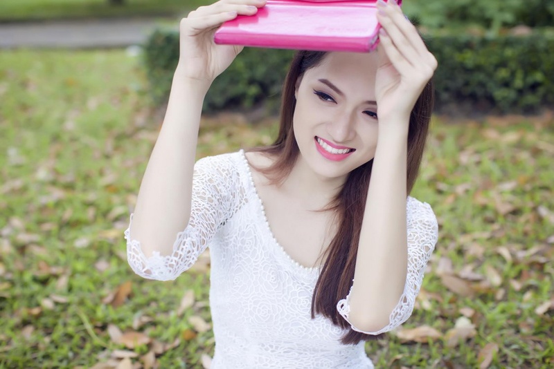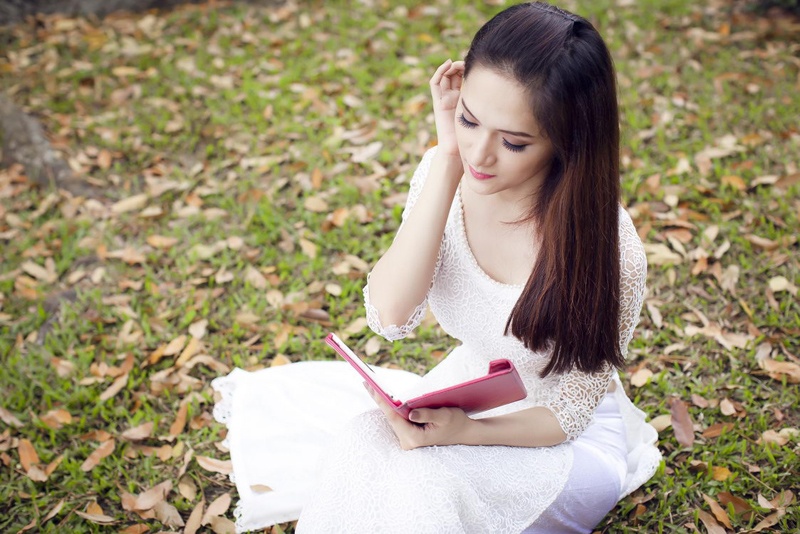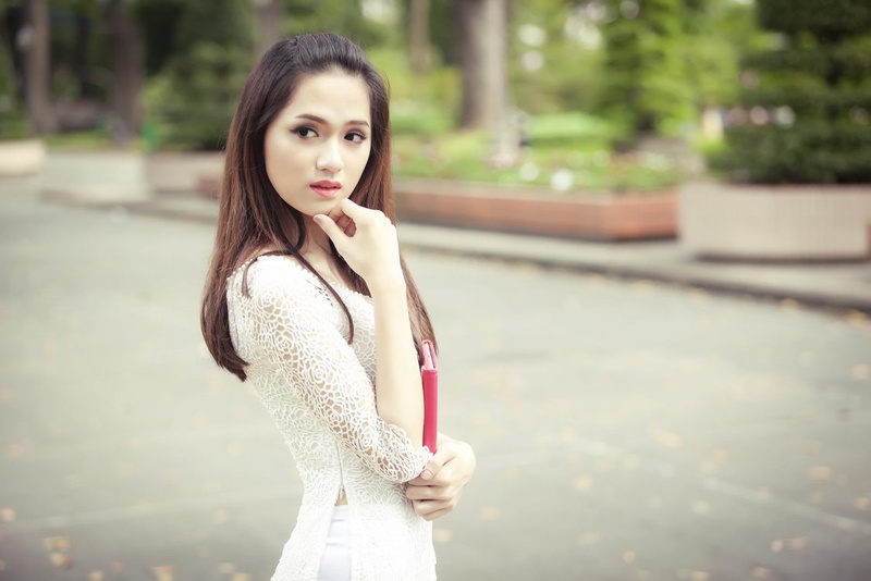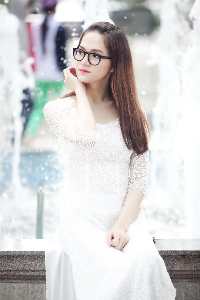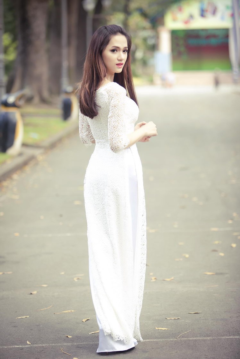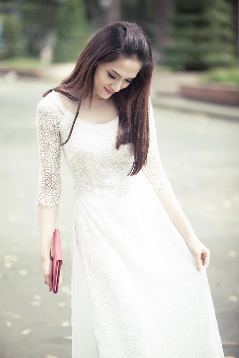 | Trong tà áo dài trắng mà NTK Thuận Việt dành riêng cho vóc dáng của nữ ca sĩ, người đẹp gốc Hà thành đã lột tả được hết những nét đẹp của một cô gái tuổi mới lớn, e thẹn nhưng không kém phần cuốn hút.