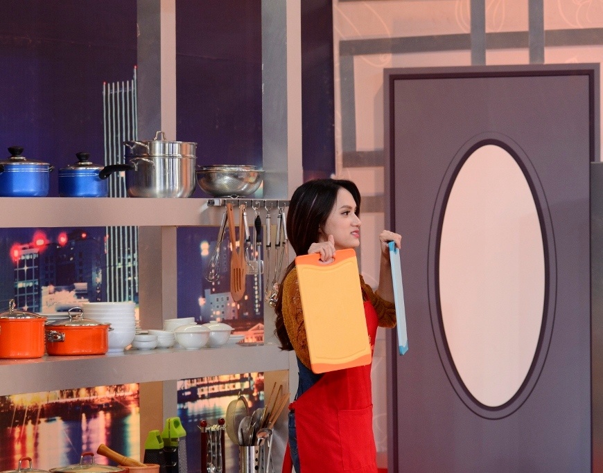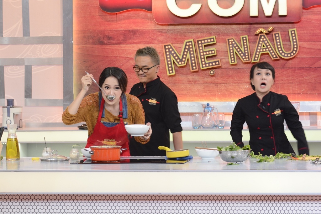| MC Việt Hương phải chịu thua trình độ nấu ăn "siêu đẳng" của Hương Giang vì gần hết giờ cô mới nhớ mình chưa nêm nếm gia vị. |