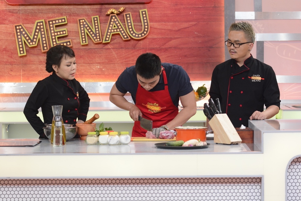 | Nếu Hương Giang đem đến sức nóng cho gian bếp thì Lân Nhã lại là một hơi thở nhẹ nhàng vì sự điềm tĩnh, cẩn thận của anh. Không cự cãi như đối thủ, Lân Nhã và mẹ hợp tác rất ăn ý trong từng khâu. |