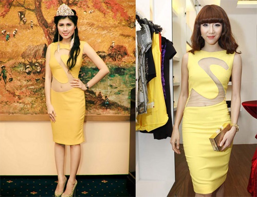 Gần đây nhất là sự cố ''đụng hàng'' với á hậu Hoàng Anh, giọng ca Idol diện một thiết kế cúp ngực gợi cảm giống với mẫu váy mà Á hậu Việt Nam 2012 từng mặc.
