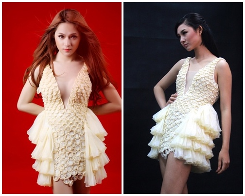 | Khi tham dự một dự án xã hội, Hương Giang và Trà My cùng mặc chung một thiết kế váy làm bằng bao cao su. |