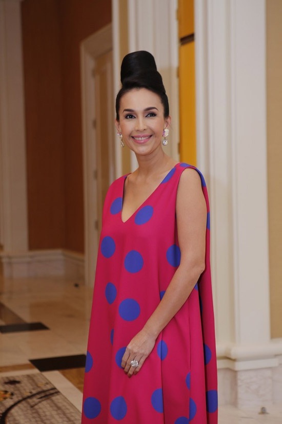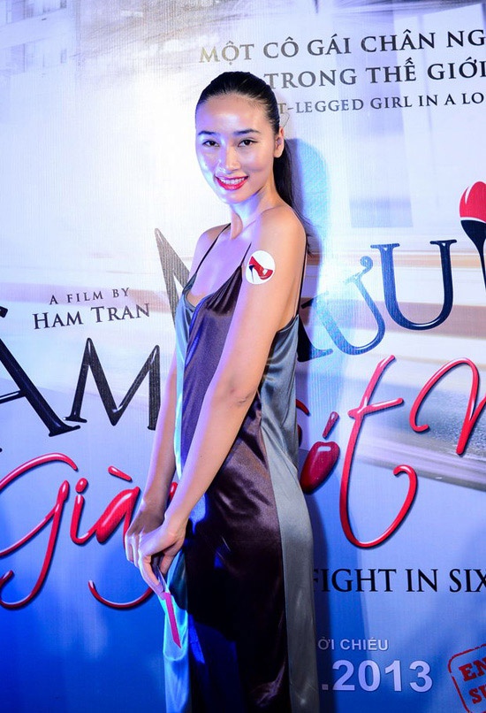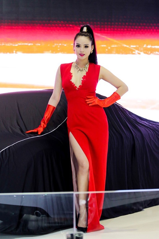 | Hương Thảo mặc váy đỏ xẻ vạt sang trọng, nhưng đôi găng tay đỏ chất bóng bẩy của cô lại khiến bộ đồ bị mất điểm trầm trọng. |