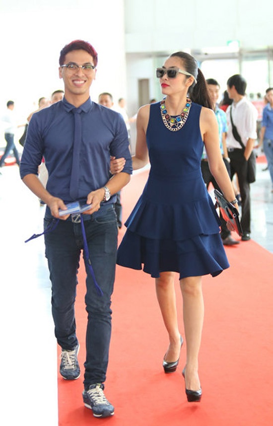 | Bộ váy của Tăng Thanh Hà khá đẹp, đôi giày cũng rất hài hòa. Duy chỉ có vòng cổ quá màu mè cùng kính râm kiểu dáng thô cứng, gam màu lệch lạc đã phá hỏng nét nữ tính của trang phục. |