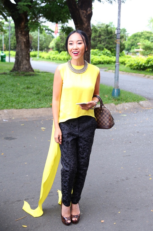 | Trang phục của Đoan Trang cũng có nhiều khuyết điểm khiến tổng thể kém sang trọng. Thiết kế áo có phần đuôi dài không thuộc bất kỳ xu hướng thời trang đang thịnh hành nào của năm 2015. |
