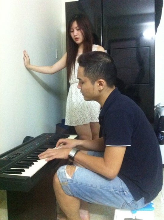| Hương Tràm tập luyện cùng Khánh Duy - đội của Quốc Trung trong cuộc thi The Voice 2013. |