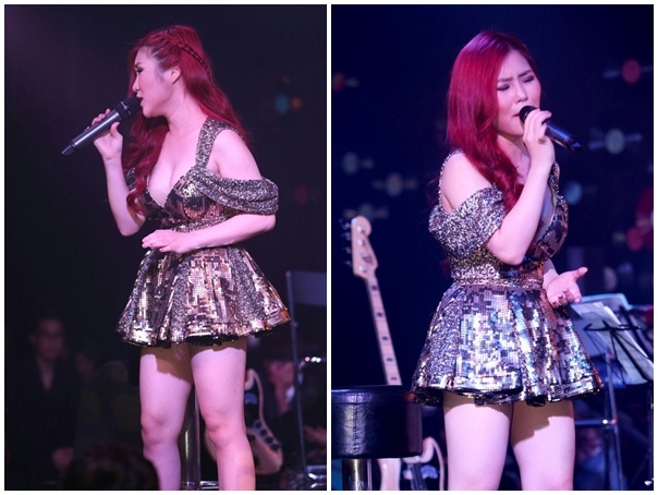 Nữ ca sĩ vận dụng mốt ''giấu quần'' khi lên sân khấu. Tuy nhiên, kiểu áo đính kết quá nhiều hạt cườm khiến hình ảnh người mặc trở nên sến sẩm.