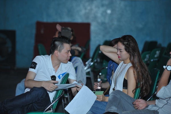 | Anh chàng trao đổi kịch bản với Minh Hằng và Trà My Idol. |