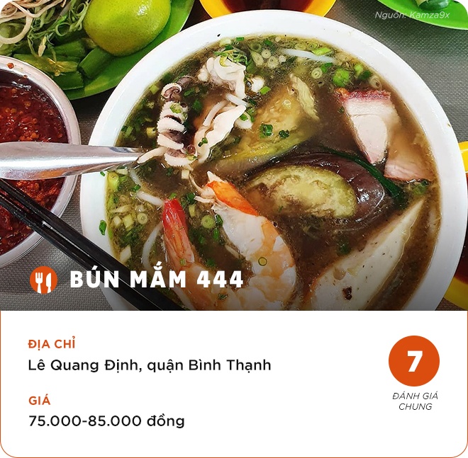 Bún mắm 444 được ưa thích nhờ phù hợp với khẩu vị của người Sài thành. Nét đặc trưng của món ăn nằm ở nước dùng nấu từ mắm cá sặc, gia giảm gia vị đúng cách. Nước dùng của quán có vị mặn ngọt đậm đà, không bị gắt và vẫn giữ được mùi thơm vốn có. Ngoài ra, mắm me, ớt sa tế và các loại rau miền Tây ăn kèm đều vừa miệng.
