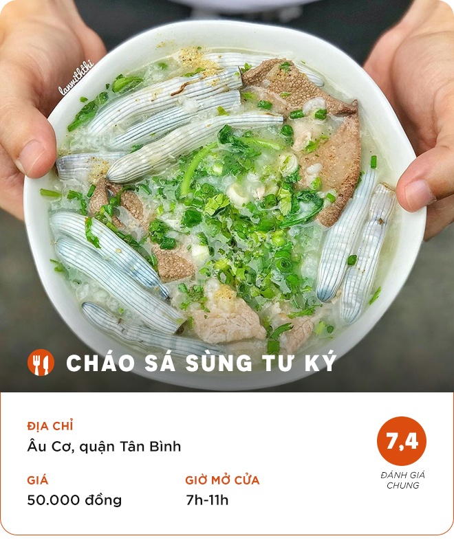 Thư Nguyễn: "Nghe danh cháo sá sùng đã lâu, nay mình mới được ăn thử. Kiểu cháo tiều nhưng thêm sá sùng. Vị cháo vừa ăn, ngoài sá sùng còn có cật, thịt heo, phèo và cá, đồ ăn tươi ngon, ăn cùng rau tần ô và gừng thái sợi, thêm nhiều tiêu rất ấm người. Mình ăn ngay hôm trời mưa to nên càng đã. Chén nước chấm ngon lắm, nhiều gừng, vị chua chua".