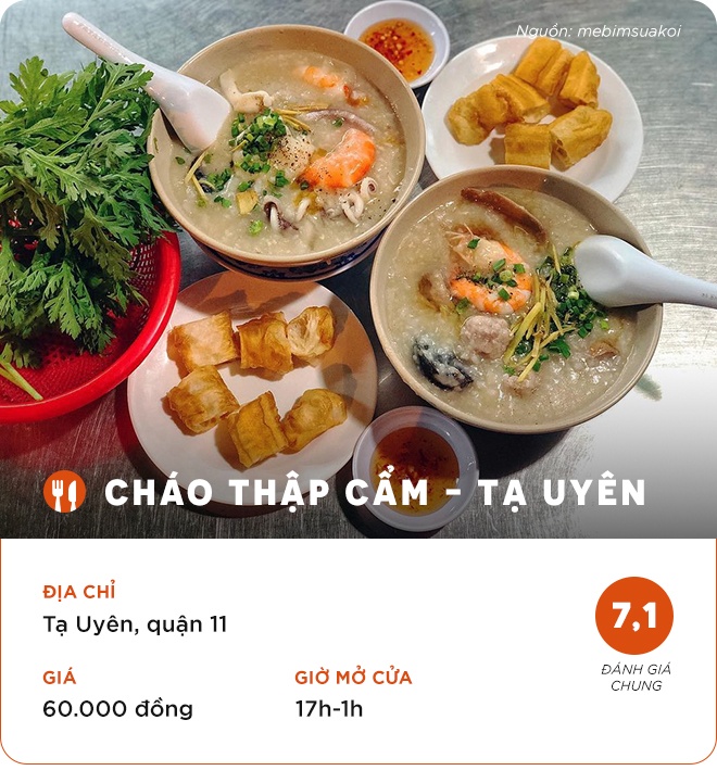 Krissi Nguyen: “Lâu lâu đổi khẩu vị, mình ghé quán ăn thử thì thấy khá ổn. Cháo ngọt tự nhiên. Giá hợp lý với 50.000 đồng/tô thập cẩm, gồm một miếng cật, 2 lát heo, 5-7 con sá sùng, 2 miếng phèo, 2 miếng cá, đồ ăn tươi”.