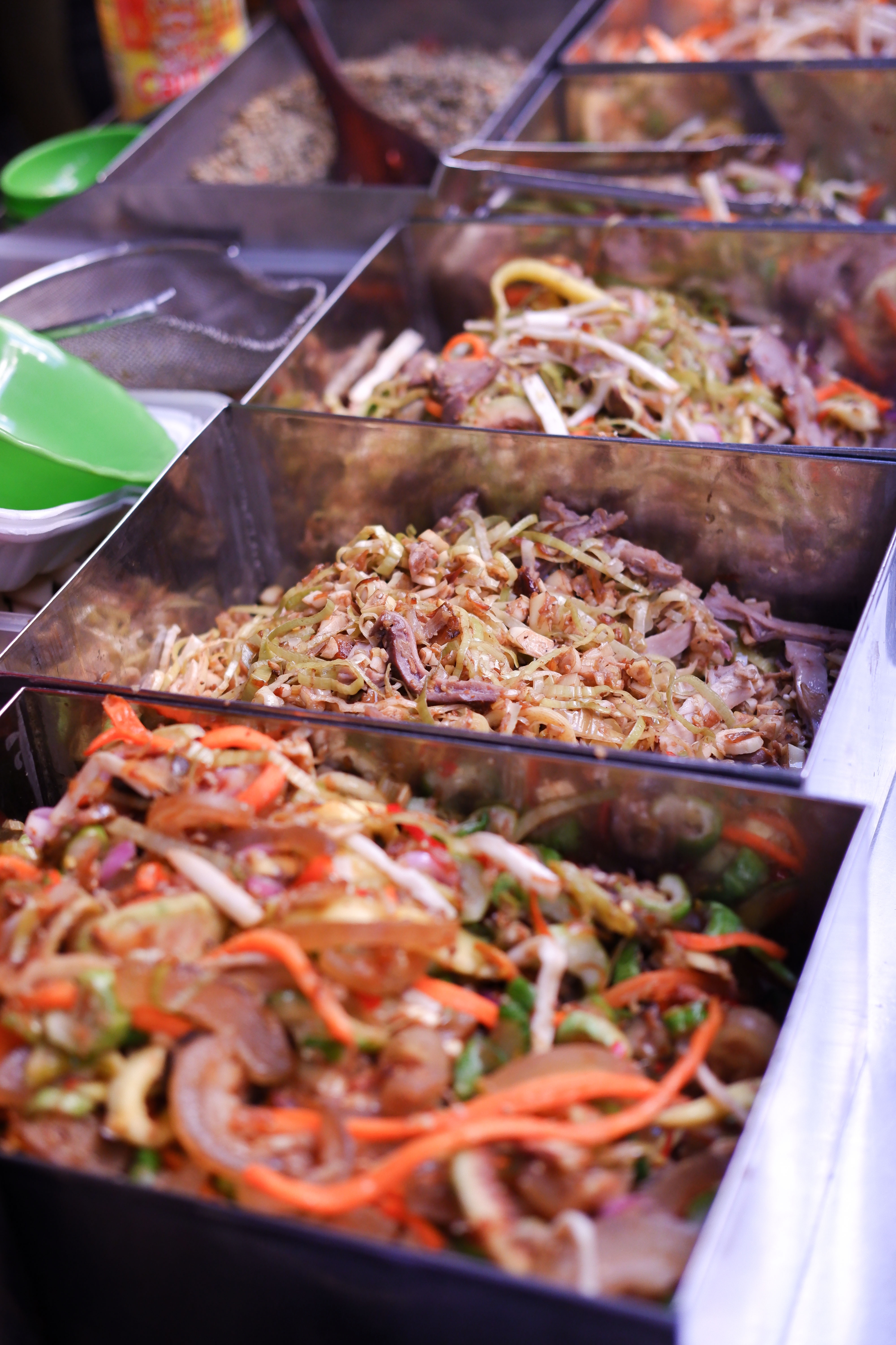 | Không khó để bạn bắt gặp những món ăn miền Trung chế biến sẵn tại đây. Lòng xào nghệ vàng rực giòn giòn, béo béo nổi bật, hút mắt thực khách ngay lần đầu nhìn thấy. Đây không chỉ là món ăn ngon mà còn là mẹo vặt trị ho hiệu quả. Nguyên liệu chính là lòng già, hẹ, củ nghệ tươi, ớt. Để tăng thêm vị ngon, người ta thường dùng kèm bánh tráng nướng. |