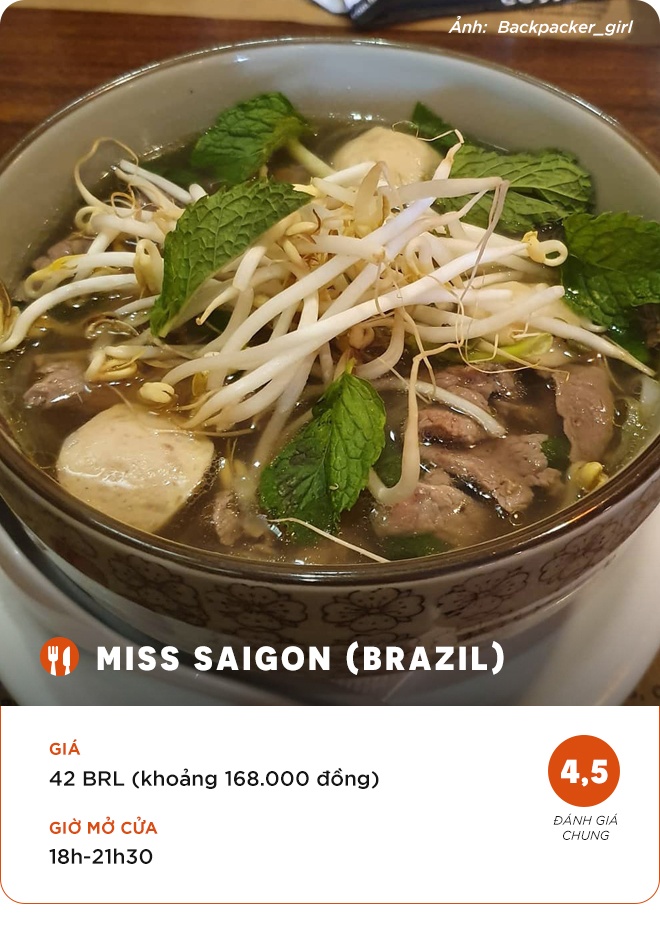 Nhà hàng khai trương từ năm 2013 bởi cặp vợ chồng người Việt ở quận Moema, Brazil. Miss Saigon phục vụ phở, bánh mì bò và bún bò Huế. Các món thường có vị mặn, đậm đà hơn để phù hợp với khẩu vị của người địa phương.