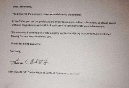 | Thư ngỏ Youtube gửi cho JVevermind nói về lý do trao thưởng. |