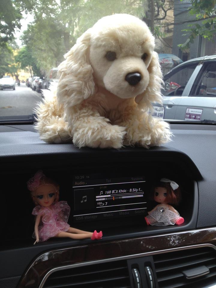 | Búp bê và gấu bông được Huyền Baby bày trí trên ô tô và gọi là “Các bạn nhỏ xinh”. Cô đang mở bản nhạc quen thuộc của nhóm B.sily - từng là mơ ước thành công trên con đường nghệ thuật của Huyền Baby, Hạnh Sino va Emily. |