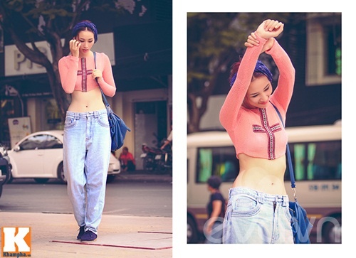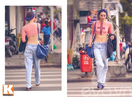 | Cô mix đồ theo phong cách thời trang tomboy, quần thụng, túi bigsize và áo crop top nhằm khoe vòng eo chuẩn sau thời gian vất vả giảm cân. |