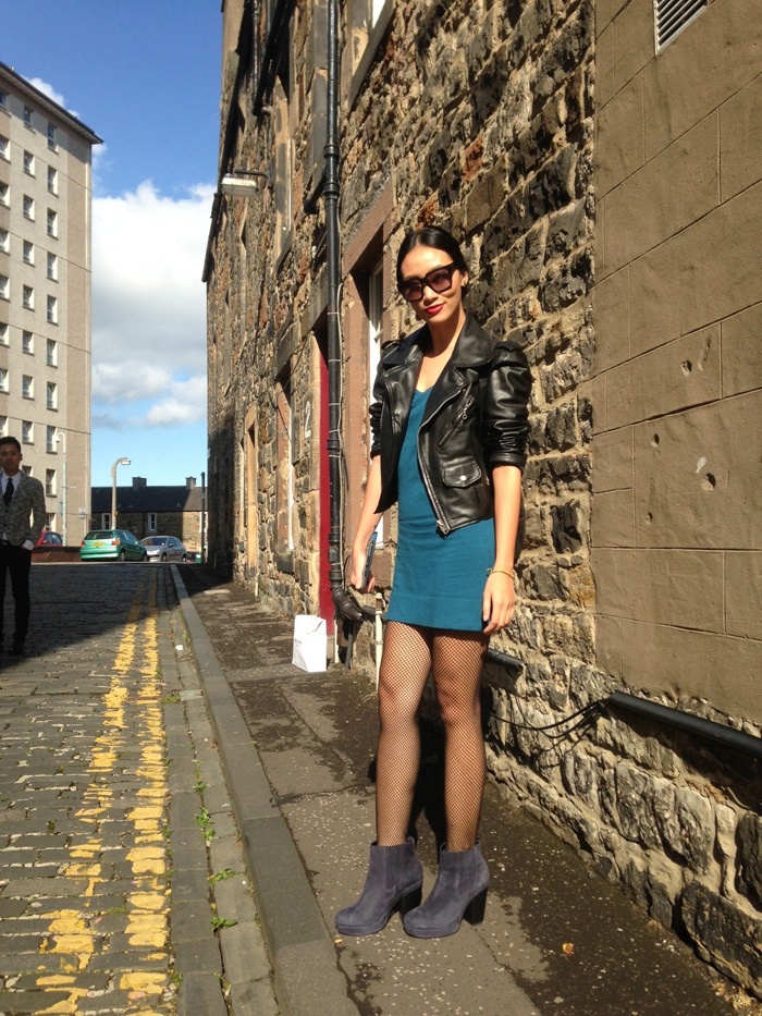 | Áo jacket chất da, giày boot cổ ngắn, tông màu xanh hợp với gam xám, phong cách mang đậm hơi thở phố phường, phủi bụi. |