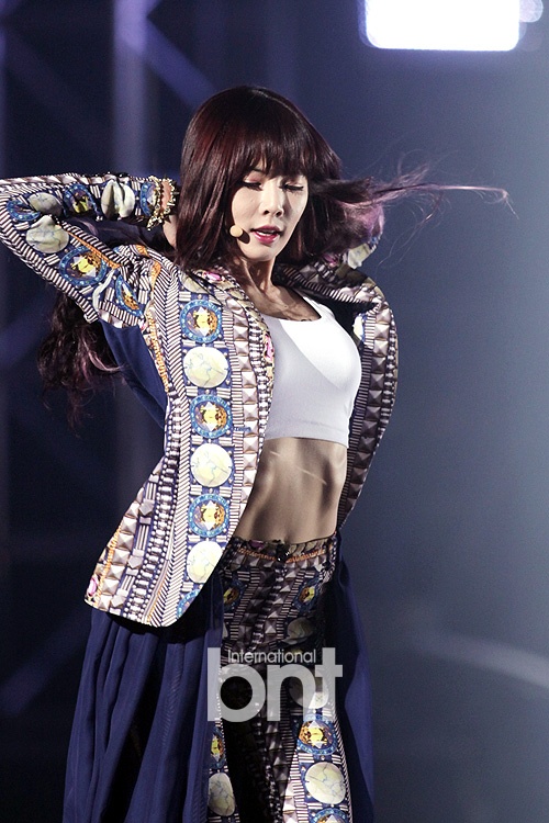 | Cùng với bộ đồ diễn, HyunA còn có nhiều động tác vũ đạo kéo áo nóng bỏng không khỏi khiến khán giả phấn khích theo. |
