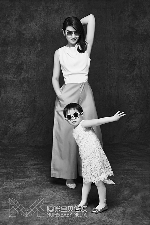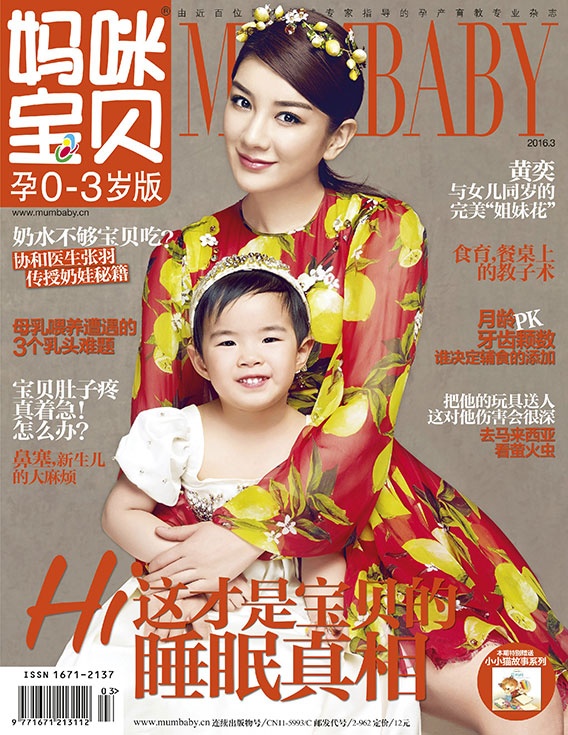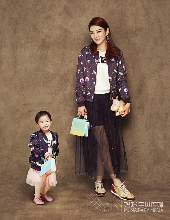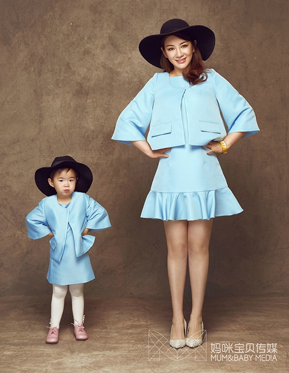 | Hai mẹ con diện đồ đôi trên tạp chí. Bé Đang Đang cười rạng rỡ trước ống kính. |