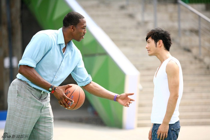 | Phút vui vẻ của Huỳnh Hiểu Minh và Dwight Howard trên phim trường. |