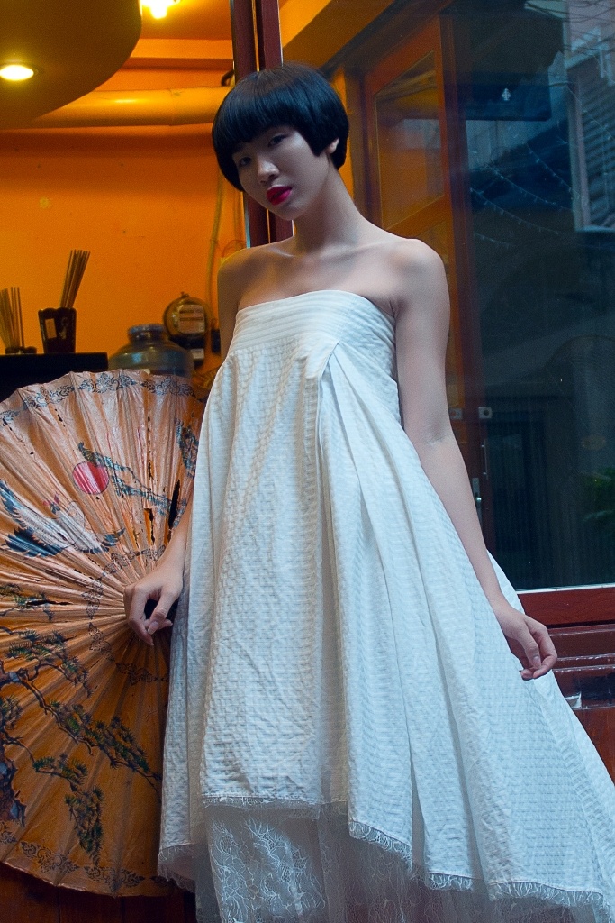 | Huỳnh Nu trong một thiết kế với chất liệu voan và ren, điểm nhấn ở phần tay áo ren cùng cách tạo độ nhún của vải tạo độ mềm mại. |