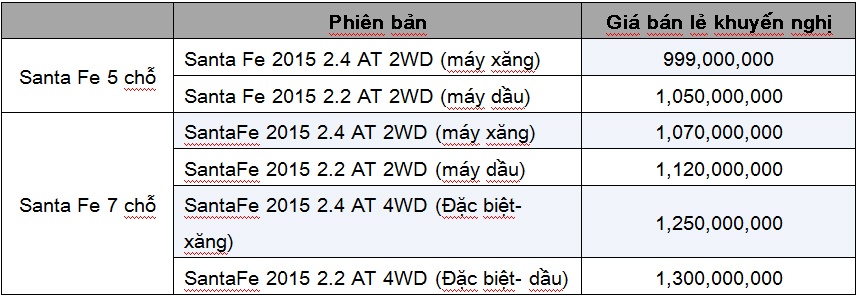 | Bảng giá cập nhật dòng xe Santa Fe 2015 phân phối chính hãng ở Việt Nam. |