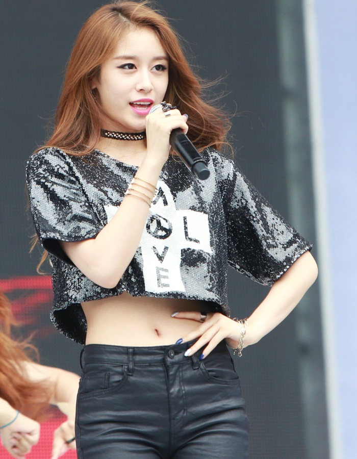 | Jiyeon (T-ara) tự tin biểu diễn trong trang phục được làm từ chất liệu da bóng. |