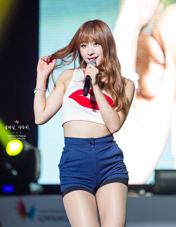 | Nhóm nhạc EXID chọn combo gồm áo tanktop và quần short vừa dễ biểu diễn lại vừa tiện khoe dáng. |