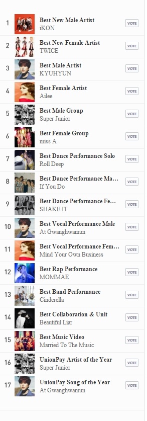 Đề cử cho giải thưởng UnionPay Song of the Year, gồm 42 nghệ sĩ, trong đó nổi bật nhất gồm có: Kyuhyun (tạm đang dẫn đầu), Big Bang, CNBlue, EXO, GOT7, AOA, Taeyeon SNSD, Sistar, Infinite …