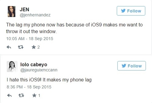 Theo tác giả Christian Zibreg của trang iDownloadblog, bản thân anh cũng là nạn nhân của hiện tượng giật lag mà iOS 9 gây ra. "Một vài người dùng cho biết iOS 9 còn lag hơn cả iOS 8. Thật không may, tôi cũng là một trong số những người đó". Người dùng phản ánh rằng máy bị lag một cách toàn diện, và một bộ phận nhỏ cho biết họ bị lỗi crash hệ thống. Lỗi xảy ra không chỉ ảnh hưởng đến thiết bị iOS đời cũ, mà thậm chí các máy mới ra mắt gần đây cũng không phải là ngoại lệ.
