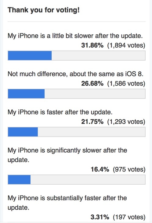 Một cuộc bỏ phiếu trên trang 9to5Mac cho thấy hơn 30% người dùng phàn nàn iPhone chạy chậm hơn sau khi nâng cấp; còn số người cho rằng máy chạy nhanh hơn chỉ chiếm 3%.