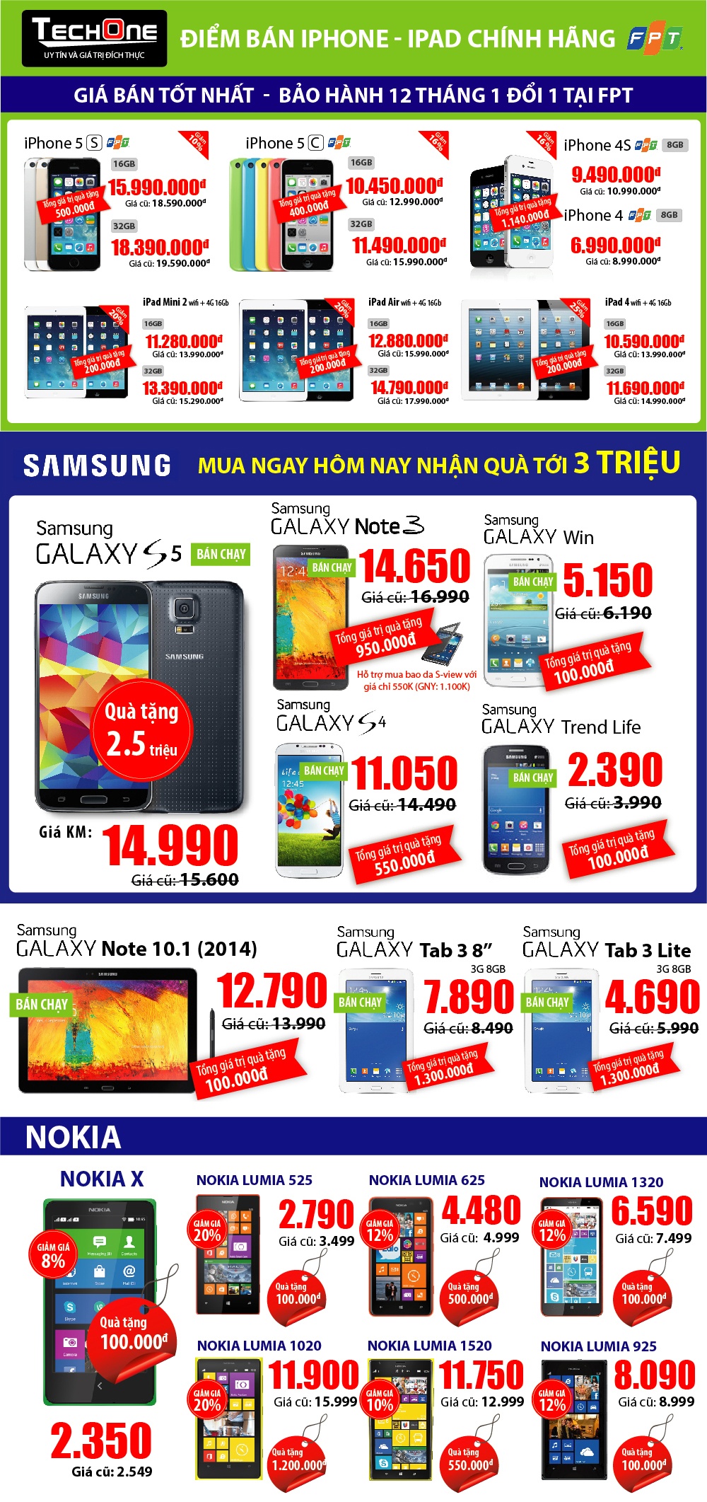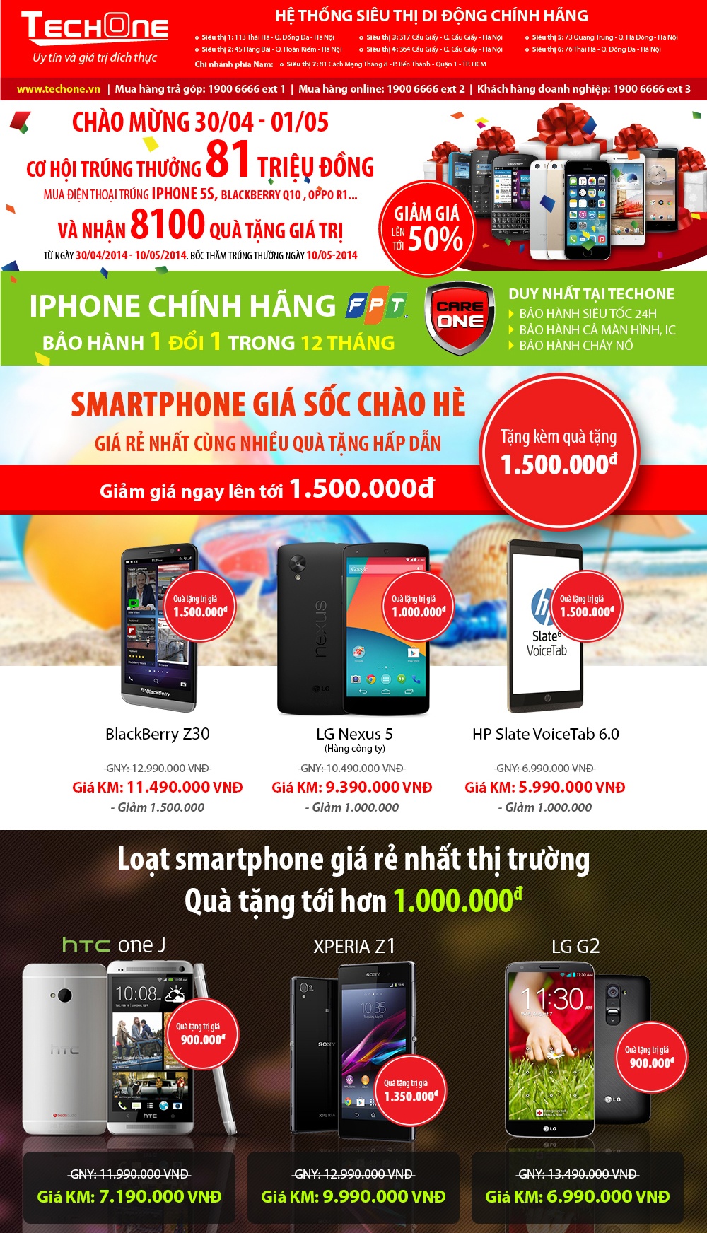 Chào mừng ngày Giải phóng Miền Nam 30/4 và Quốc tế lao động 1/5, hệ thống siêu thị di động TechOne tổ chức chương trình khuyến mại đặc biệt dành cho khách hàng tới thăm quan mua sắm tại hệ thống siêu thị di động TechOne. Chương trình kéo dài từ ngày 28/4 đến hết ngày 10/5. Theo đó khách hàng sẽ được giảm giá lên tới 50% khi mua iPhone, iPad, smartphone cụ thể như sau: