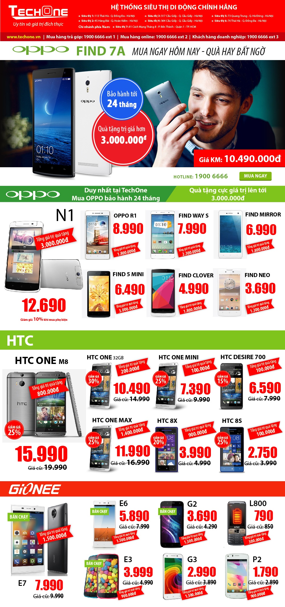 - OPPO Find 7A giá 10.490.000 đồng tặng kèm gói quá tặng trị giá lên tới 3 triệu đồng (Thẻ nhớ 16Gb trị giá 450,000đ + Dán màn hình + Bút cảm ứng trị giá 150.000 đồng + Loa Beats Mini trị giá 700.000 đồng + Cặp đồng hồ thời trang trị giá 1.500.000 đồng + Mua gói bảo hành 24 tháng với giá ưu đãi). Trên 3.000 sản phẩm được giảm giá lớn tặng quà khủng khách xem tại: www.techone.vn.