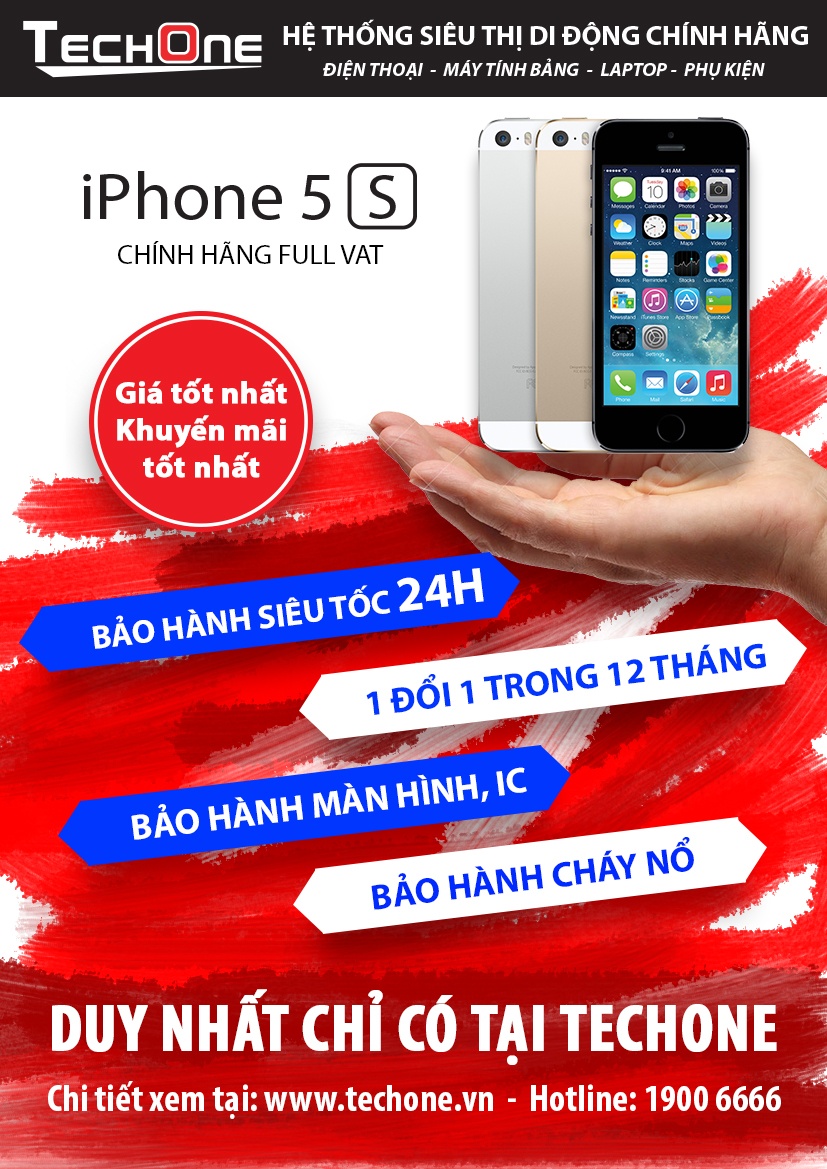 iPhone 5S chính hãng duy nhất chỉ có tại TechOne với chế độ bảo hành 1 đổi 1 trong 12 tháng, bảo hành cháy nổ IC, bảo hành cả màn hình đổi với chế độ bảo hành siêu tốc 24h máy lỗi đổi luôn máy khác giá cũ 17.190.000 đồng giá khuyến mại 15.500.000 đồng tặng kèm kho ứng dụng bản quyền trị giá 30.000.000 đồng.