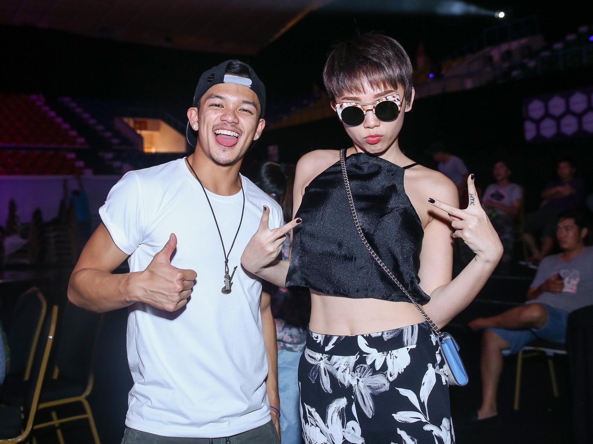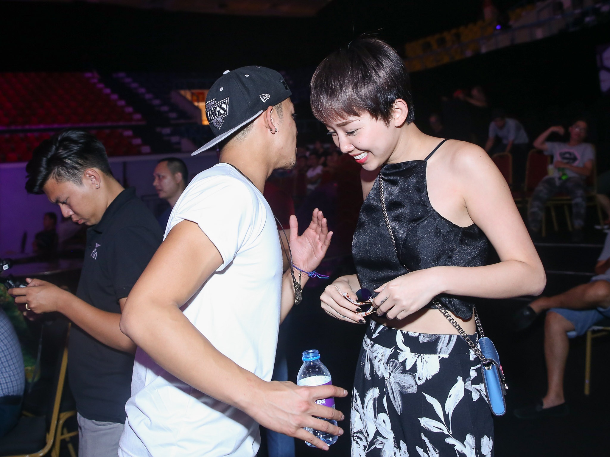 Thấy Tóc Tiên vừa đến sân khấu, Trọng Hiếu đã tranh thủ trò chuyện cùng nữ ca sĩ. |